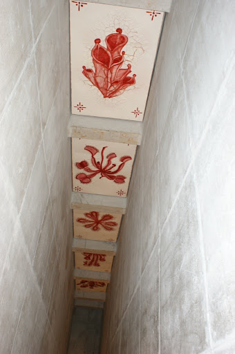 Ao subir as escadas somos tomados pela quarta obra apresentada :"Celacanto Provoca Maremoto" ,que envolve totalmente o ambiente contrastando o seu azul e branco caracteristicos.Especialmente criada para o espaço a partir de um painel original em apenas uma parede, a obra vale-se do barroco e da azulejaria portuguesa como principais referências históricas, mas também da própria história colonial que une Portugal e Brasil: afinal de contas aqui estamos nos domínios do mar, o grande elemento de ligação entre velho e novo mundos no período das grandes navegações.Os azulejões fazem referência à maneira desordenada e casual com a qual são repostos os azulejos quebrados dos antigos painéis barrocos.